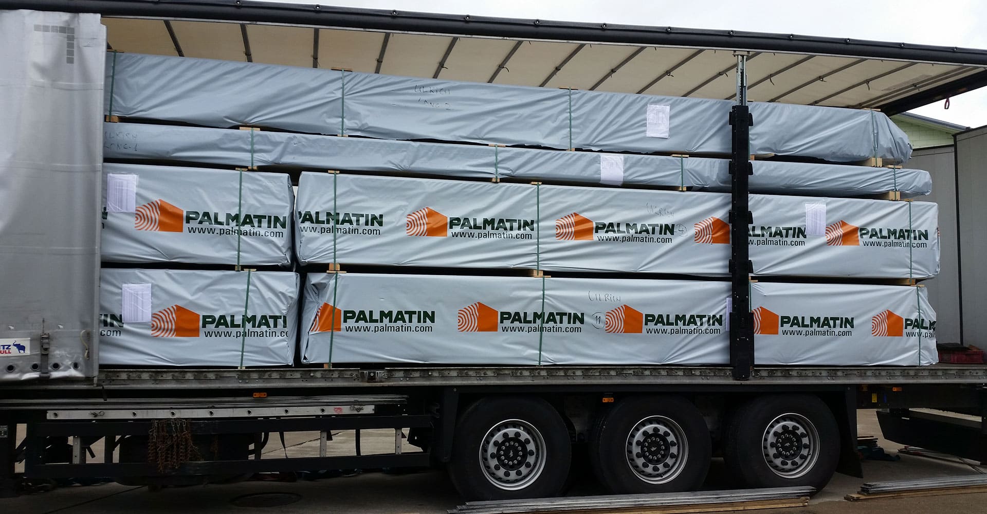 A truck on a construction site carrying prefabricated elements for building a log house. The prefabricated elements are made of wooden logs and are securely fastened to the truck bed. The prefabricated elements will be used to construct the walls of the log house. Parts of the building are made off-site and then transported to the construction site for assembly. This saves time and money, as well as ensures a higher degree of accuracy in the construction process. The workers unload the prefabricated elements from the truck and begin the process of constructing the walls. They will use cranes or other heavy machinery to lift the elements into place and secure them to the foundation of the house. Once the walls are in place, the workers will continue the building process by constructing the roof, adding windows and doors, and finishing the interior. Building a log house using prefabricated elements is an efficient and cost-effective method for building a beautiful and sturdy home. Using high-quality materials and precise manufacturing techniques ensures that the finished product will be durable and long-lasting.